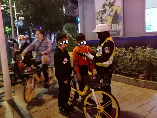 2月1日晚,罗湖交警大队东门中队警辅队员曾惠珍执勤时发现两名10岁左右的小男孩在主干道深南大道上嬉笑打闹,一名男孩骑行共享单车,另一名男孩跟在自行车后面跑动,全然不顾路上疾驰的车辆。