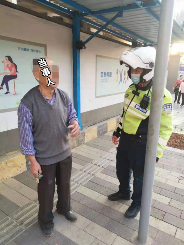 1月29日下午,罗湖交警大队东湖中队民警钟文辉带领队员在太白路太白充电桩巡逻时,看见一位六旬老人在路口不断徘徊,老人手中握着水瓶,紧皱眉头,急得满脸都是汗。