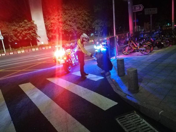 11月3日凌晨,罗湖交警大队东湖中队铁骑队员凌伟豪和刘尚鹏开展晨风行动,5时10分,巡逻至文锦北路出关方向时,看见斑马线上躺卧着一名男子,队员立即上前查看情况。
