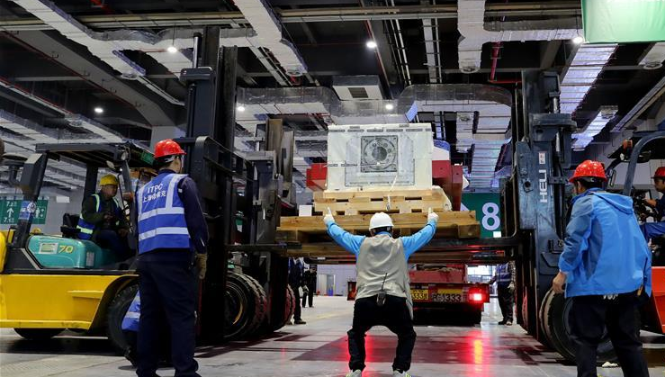 当日,来自德国的首届进口博览会最大展品——“金牛座”龙门铣床完成初步组装,将运往国家会展中心(上海)3号馆进行最后的安装施工。