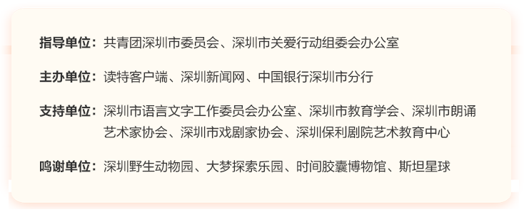 为助力建设良好的青少年阅读环境,激发学生阅读兴趣,倡导亲子阅读,共建和谐家庭关系。2021年,“谁是故事大王·第五季”在共青团深圳市委员会、深圳市关爱行动组委会办公室的指导下再出发。更长的活动周期,更丰富的参与形式,更专业的赛制,等你来解锁与挑战!让阅读成为最动人的风景,让故事的魅力感动深圳。说明:所有参赛者报名成功后,均承认并允许主办方将个人参加本次活动的照片或视频相关资料刊发在各类媒体杂志报纸上,用于活动宣传。