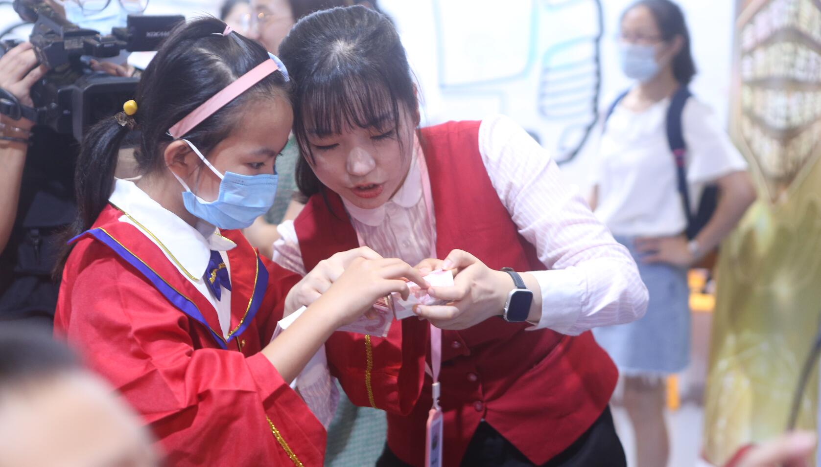 华夏银行金牌点钞手老师细心教导小飞侠们现场点钞