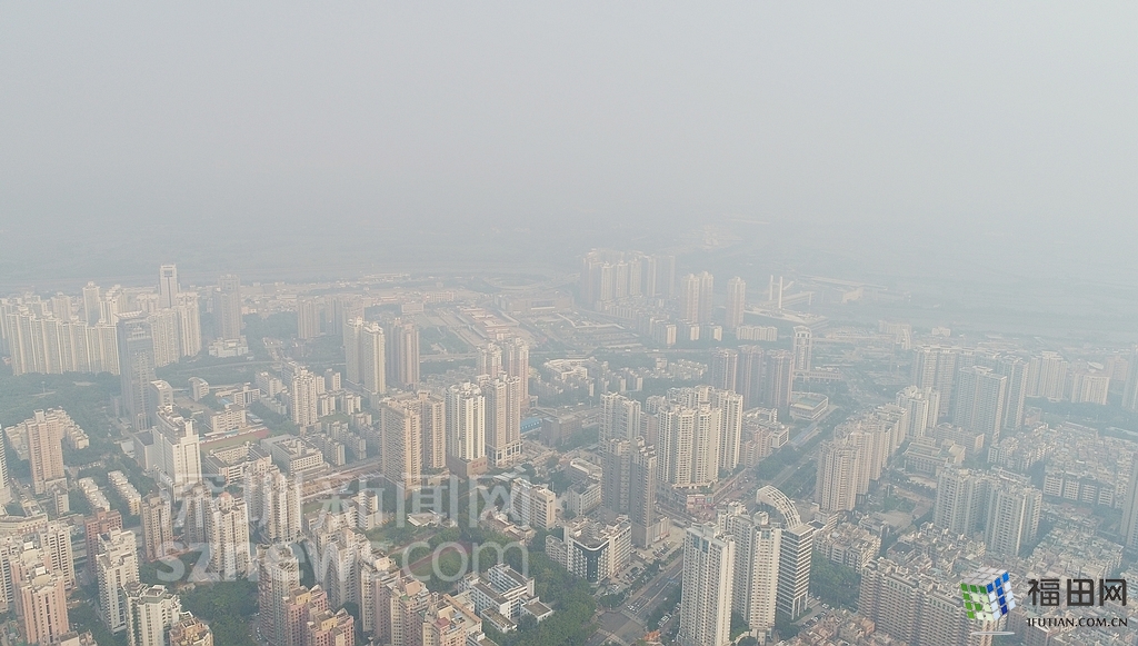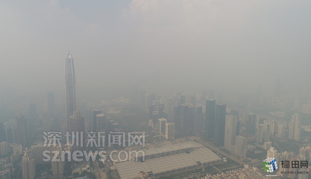 无人机在数百米高空俯瞰灰霾笼罩下的深圳中心区,大半个城区都看不清楚。