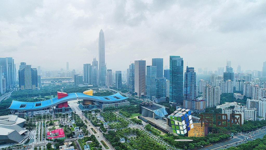 俯视近处的福田中心区。正南方的市民中心横卧在前,犹如一只振翅欲飞的大鹏鸟。