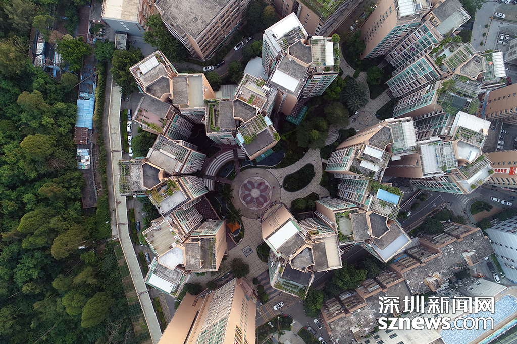 渔民村社区建筑多为高层小区,社区中间开辟有居民文化广场,从高空俯瞰,整个社区宛如一座美丽花园