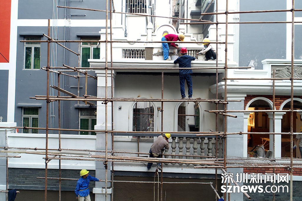 12月14日下午,建筑工人对水围村民房进行外立面改造
