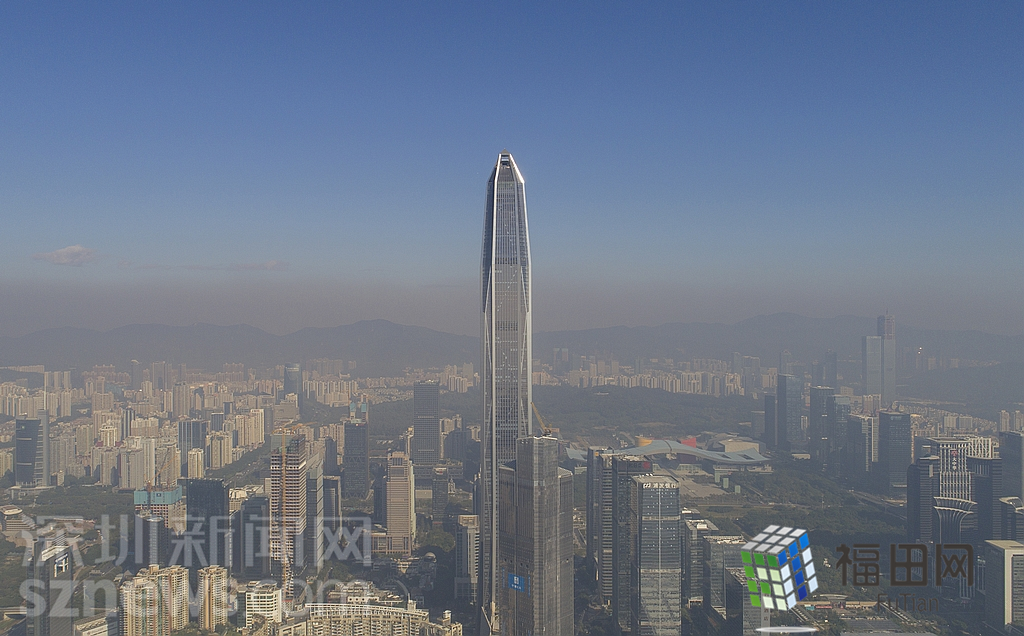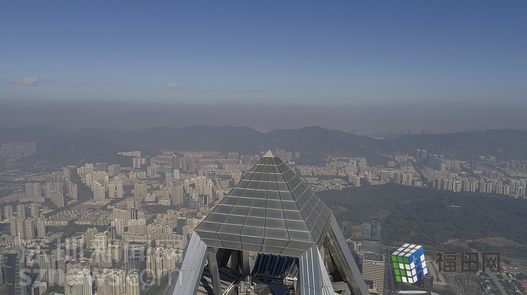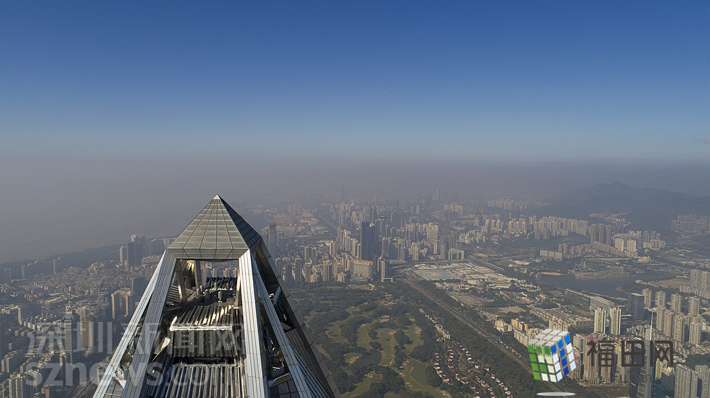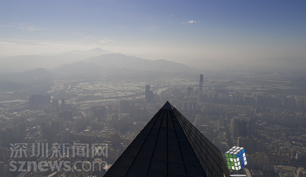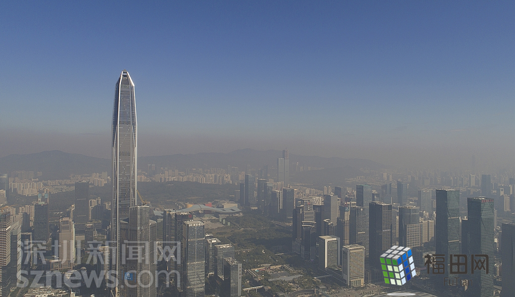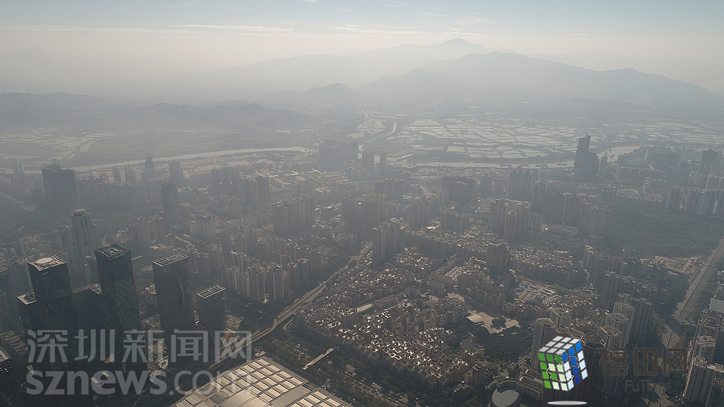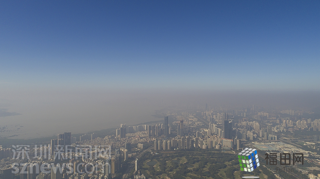 1月18日上午,记者操控无人机俯瞰深圳中心区发现,灰霾将天空“割裂”成一道泾渭分明的界线,把城市笼罩得如同一个充满雾霭的森林。从平安金融大厦的上空远眺,西南面的深圳湾在灰霾的笼罩下变成了一片“沙漠”,东面的京基一百几乎被灰霾“吞没”,北边平时肉眼可看的梅林山也因为能见度较低变得若隐若现,南面的米埔湿地也被云遮雾绕。
