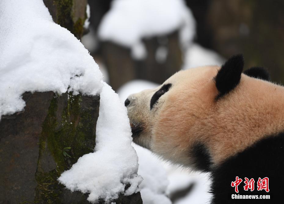 浙江杭州大熊猫雪地里活动进食憨萌可掬