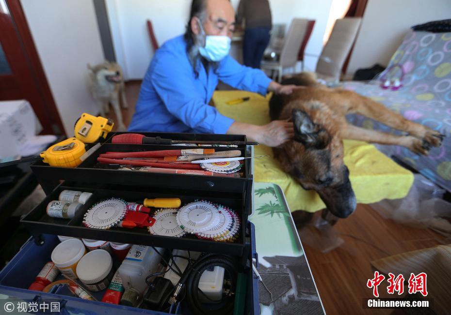 2018年春节期间,前往北京市朝阳区高碑店乡大黄庄社区甲3号的人络绎不绝,他们来这里的目的,就是为了让自己的爱犬“重生”。这家店的主人名叫老郭,是一位动物标本制作师,他对来客常说的一句话就是:“你带着躺下了的宠物来,我还你一个站起来的它”。图为郭元虎正在制作狗标本。文字来源:法制晚报 图片来源:视觉中国