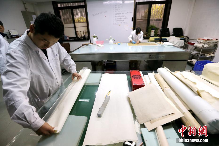 “文物医生”在“书画文物修复室”内工作。中新社记者 张远 摄