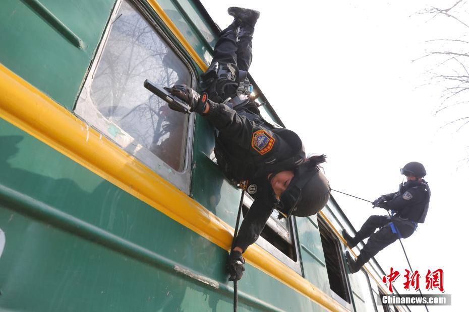 3月6日,北京铁路公安处特警支队铁鹰突击队副大队长鲍金凤带着男队员进行科目训练。在男性占绝大多数的的特警支队中,女特警格外亮眼。进入2018春运以来,30岁的鲍金凤队长担负起新学员的训练工作,每天带早操,一天四练,体能、射击、综合技能,高难度的科目动作,这个女队长为男警员做示范。中新社记者杨可佳 摄