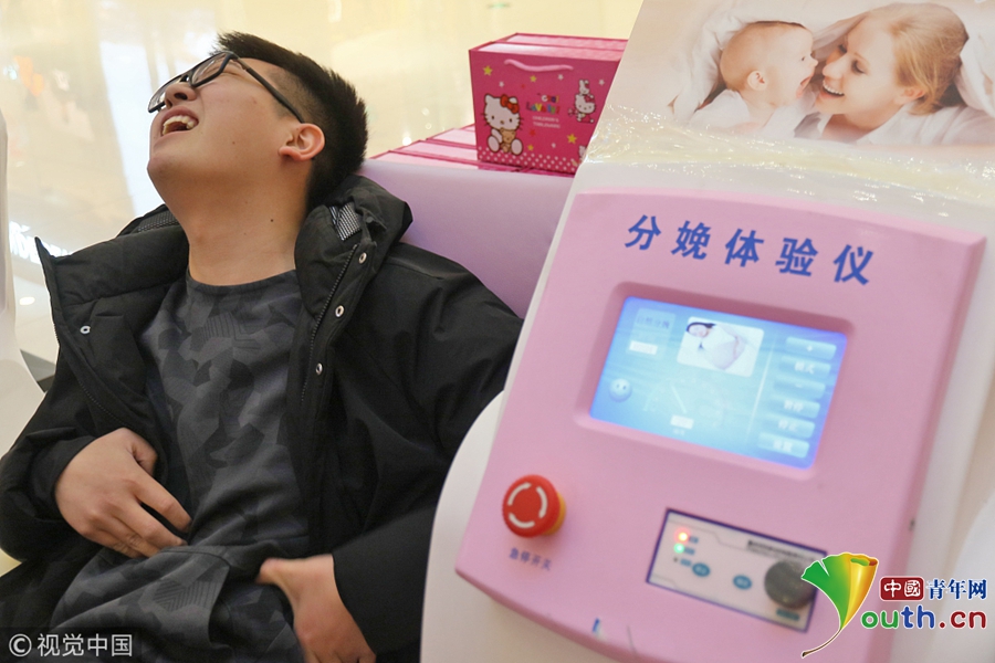 2018年3月8日,一名男士在山东烟台大悦城通过“分娩体验仪”感受“分娩”时的阵痛。