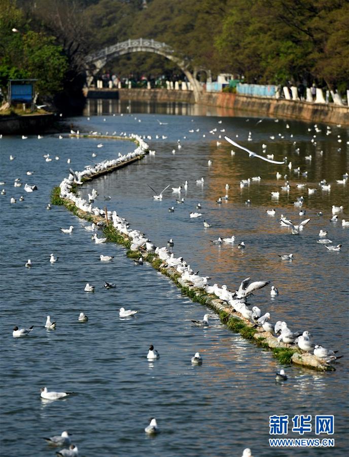 3月13日,即将返乡的红嘴鸥在昆明大观河上嬉戏。 新华社记者蔺以光摄