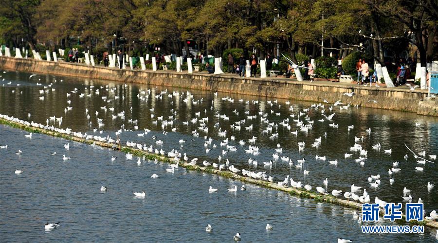 3月13日,即将返乡的红嘴鸥在昆明大观河上嬉戏。 新华社记者蔺以光摄