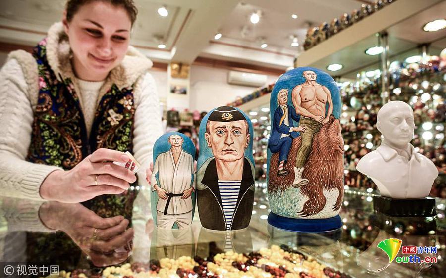 当地时间2018年3月13日,俄罗斯莫斯科,俄罗斯大选将于3月18日举行,大选主题纪念品热卖。
