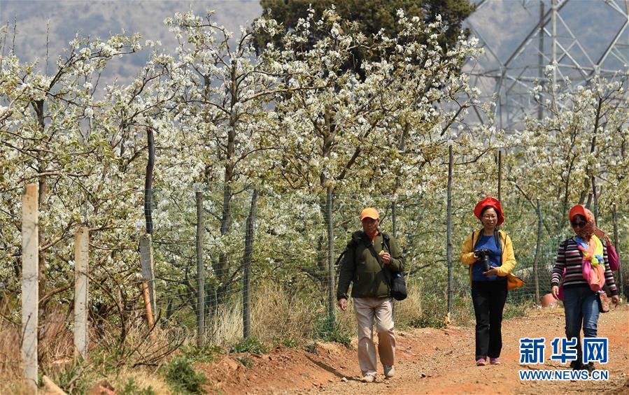 这是几名游客在云南昆明呈贡万溪冲的梨园里(3月21日摄)。近期以来,云南多地的梨花相继开放。梨花、村庄、民居、游人相映成趣,构成了一幅幅美丽的“大地春歌”图。新华社记者 蔺以光摄