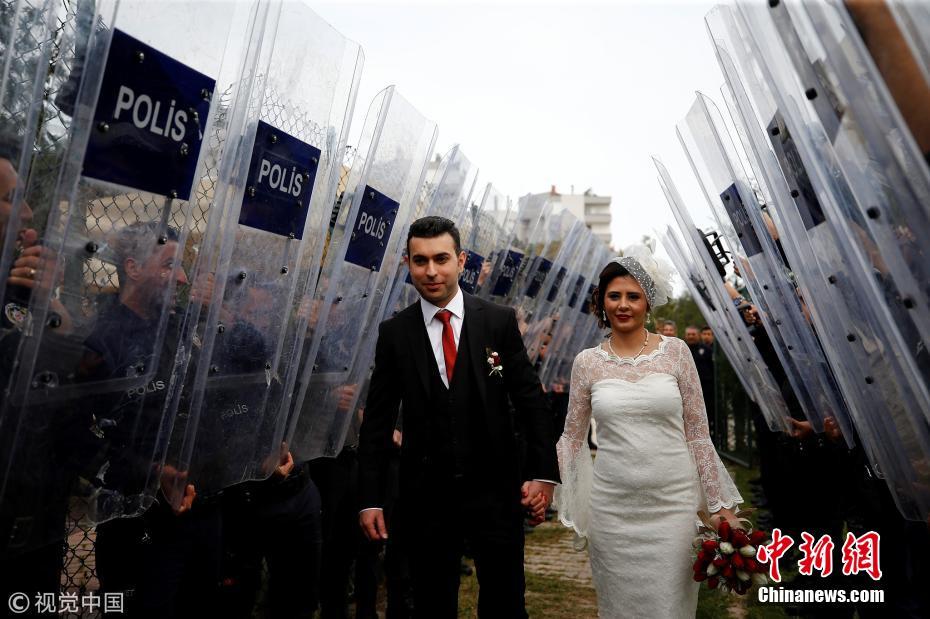 当地时间2018年3月21日,土耳其安塔利亚,警官Ceren Ekici和Taha YasinGul举行婚礼。在10个月前的一次行动中,Taha YasinGul不慎开枪击中Ceren Ekici的头部,所幸没有造成生命危险。他们的婚礼由警局同事操办,同事们举着防弹盾牌,护送这对新人走向礼台。图片来源:视觉中国
