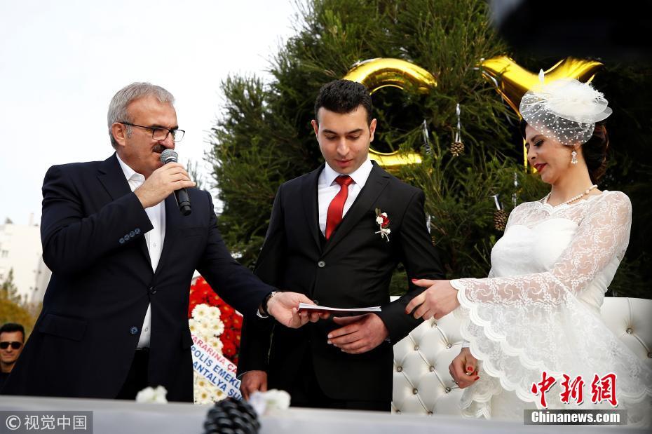 当地时间2018年3月21日,土耳其安塔利亚,警官Ceren Ekici和Taha YasinGul举行婚礼。在10个月前的一次行动中,Taha YasinGul不慎开枪击中Ceren Ekici的头部,所幸没有造成生命危险。他们的婚礼由警局同事操办,同事们举着防弹盾牌,护送这对新人走向礼台。图片来源:视觉中国