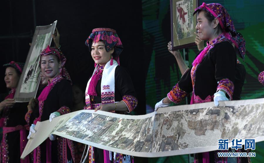 4月18日,在海南省五指山市,苗族同胞展示苗族刺绣,庆祝“三月三”。当日是农历三月初三,海南省黎族苗族同胞齐聚五指山市,欢庆“三月三”。新华社记者 赵颖全 摄