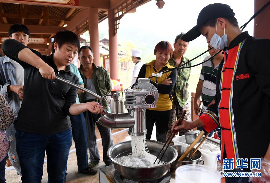 4月19日,在广西南宁市青秀区南阳镇施厚村古岳坡,游客在观看米粉制作。今年“壮族三月三”假期期间,不少市民游客前往乡村旅游观光,激发了一股乡村旅游小热潮。“壮族三月三”是广西壮族自治区确定的法定假期。新华社记者陆波岸 摄