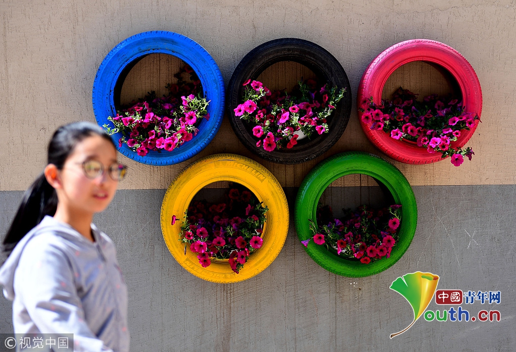 5月4日,二十余个印有卡通图案及奥运五环造型等创意轮胎花盆亮相沈阳,吸引市民。