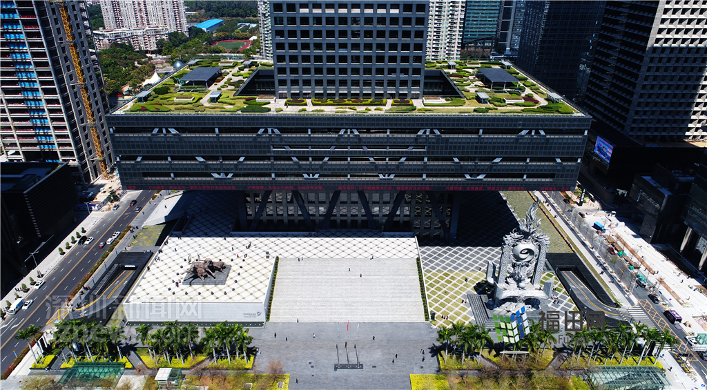 深交所由方正的塔楼和空中悬挑的裙楼所组成,大厦底座被抬升至30多米形成一个巨大的“漂浮平台”。