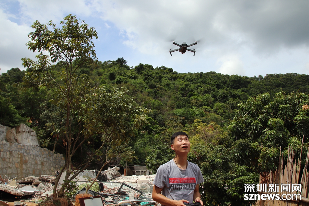深圳新闻网记者正在操作无人机对羊台山两栋拆除后的违法建筑废墟进行拍摄