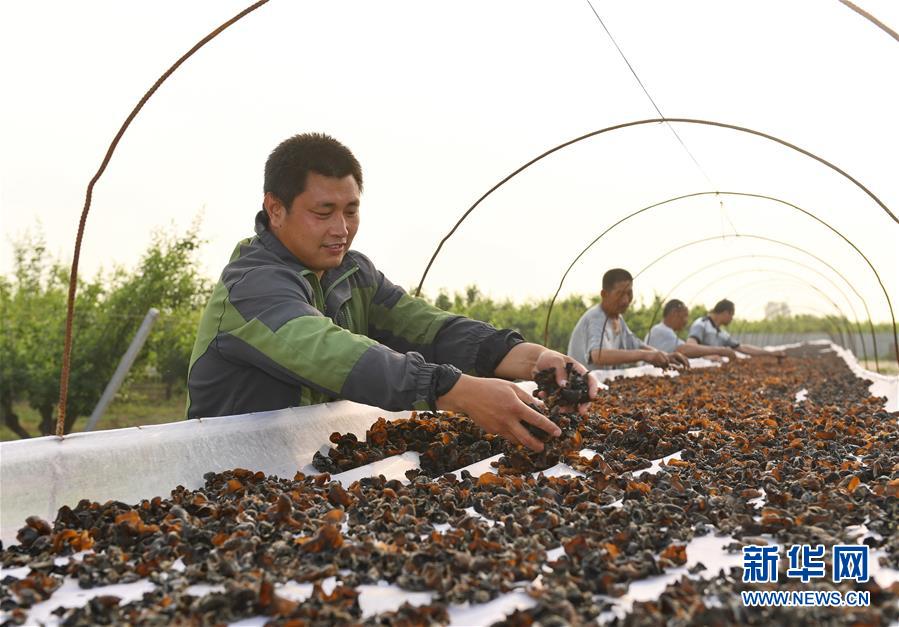 5月20日,河北省辛集市田家庄乡东张口村农民在晾晒采收的木耳。