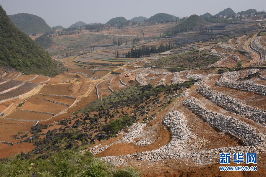 西畴县兴街镇“三光”片区石漠化综合治理工作接近尾声,一片片石山被垒成台地(2016年4月14日摄)。荒山秃岭,怪石盘亘;河道断流,重山阻隔。这是云南西畴,一个被专家称为“失去生存条件”的地方。就在这样一个地方,当地干部群众以“等不是办法,干才有希望”的奋斗精神,战天斗地、自力更生。目前,西畴县公路密度是全省3倍,行政村、自然村通公路率均达100%。今年,西畴县计划脱贫摘帽。新华社记者吉哲鹏摄