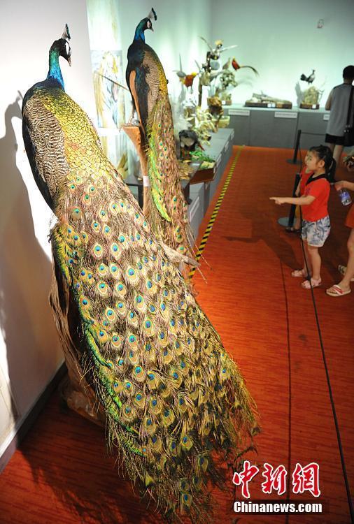 5月27日,各类飞禽走兽活灵活现地出现在民众的眼前。正在福建博物院展出的第四届中国动物标本大赛的257件惟妙惟肖的标本作品集中对外开放,让民众如进入“动物世界”。本次大赛汇集了全国标本制作企业、博物馆、大专院校、研究所等60多家单位参加,标本涵盖哺乳类、鸟类、爬行类、两栖类、鱼类等动物类群的皮张和骨骼标本。主办方希望通过标本大赛,向公众展现动物世界的美丽,宣传生物多样性和生态文明,借鉴吸收国际标本制作先进经验,提高中国野生动植物标本制作的整体水平。图为大赛参赛的孔雀标本。中新社记者 张斌 摄