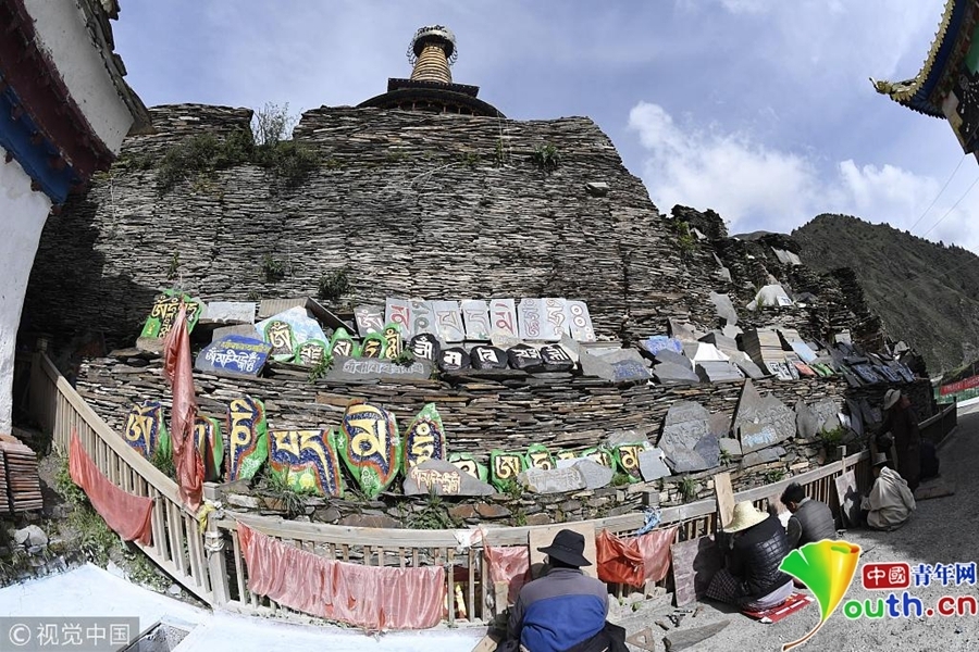 在四川阿坝州壤塘县棒托寺内珍藏约50万片明清时期镌刻的大藏经《甘珠尔》和《丹珠尔》,大藏经左高9.7米,右高9.2米,长46米、左宽160米,右宽13米,占地598平方米,是目前全世界保存最完整、规模最宏大、内容最丰富的石刻大藏经孤品。据史料记载,由明末清初60余名石匠辛勤镌刻9年而成。石刻藏文经书图文并茂,笔法流畅,疏密有致,阴阳相背,满版生辉。具有极高的文物和艺术研究价值。图为堆积的石刻大藏经孤品。