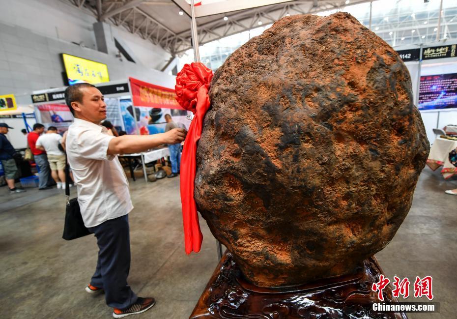 6月15日,第十一届新疆观赏石、和田玉精品博览会在新疆乌鲁木齐开幕,本次博览会参展种类涵盖珠宝、玉石、矿石、陨石、观赏石等,吸引众多奇石玩家到场“以石会友”,打造独具特色的“品石”盛宴。图为一块重达3.5吨的铁陨石,任何铁制品一旦靠近便被吸附。中新社记者刘新 摄