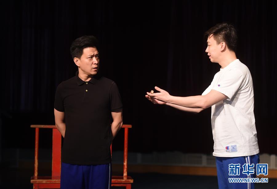 6月19日,扮演宋子文的张建峰(左)和扮演张太雷的谭正岩(右)在排练中。新华社记者 罗晓光 摄