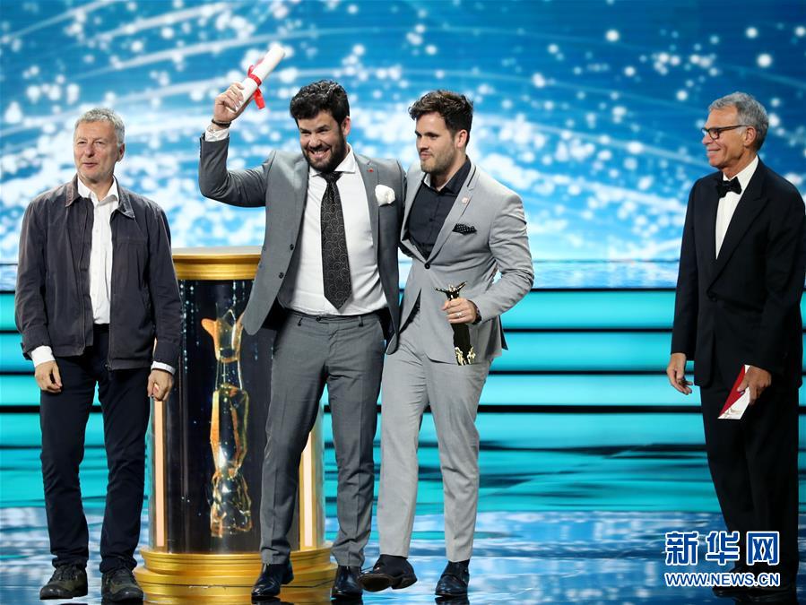6月24日,加拿大导演兄弟塞巴斯蒂安·巴鲁索(右三)与罗德里戈·巴鲁索(右二)凭借电影《翻译家》获“最佳导演奖”。当日,第21届上海国际电影节金爵奖颁奖典礼在上海大剧院举行。新华社记者 刘颖 摄