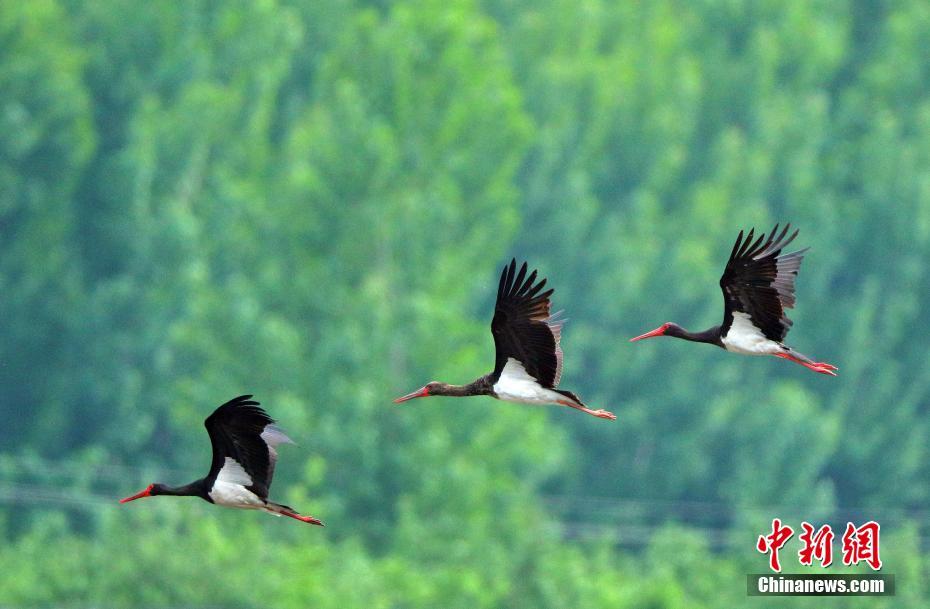7月1日,河北石家庄平山岗南水库下游滹沱河段发现成群黑鹳,最多时达12只,黑鹳是大型涉禽,属国家一级保护动物,也是世界濒危珍禽,已被《濒危野生动植物国际贸易公约》列为濒危物种。中新社发于英杰 摄