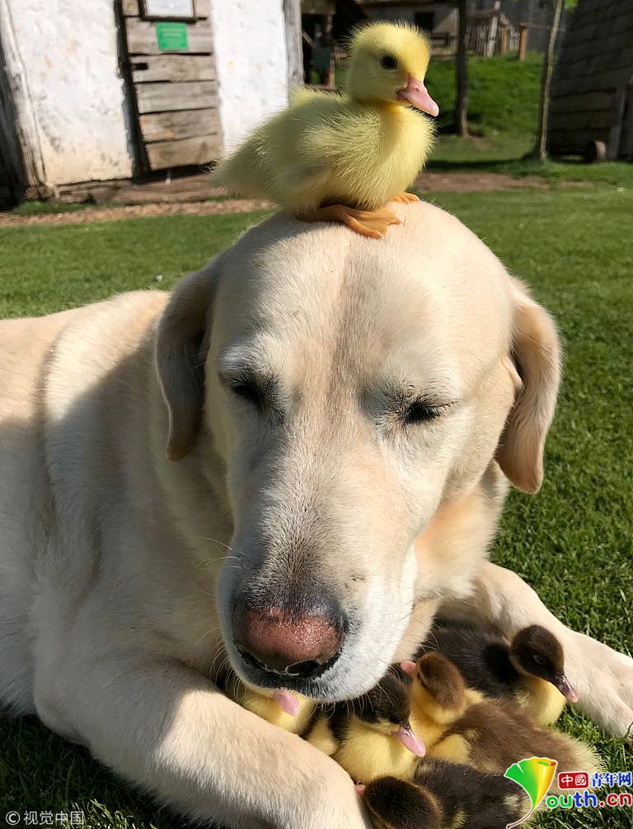 拉布拉多“收养”9只孤儿小鸭子 走路超拉风