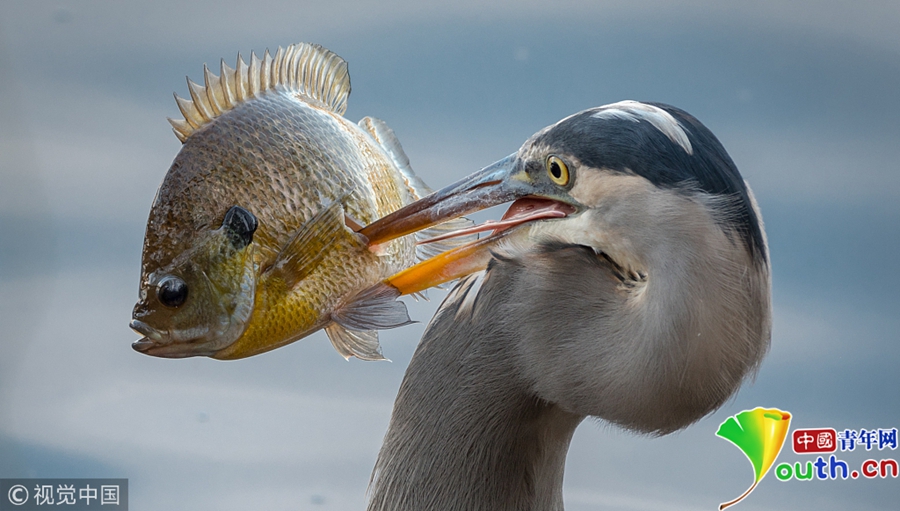 当地时间2018年1月29日,美国田纳西州纳什维尔的拉德诺湖州立公园,一只大蓝鹭刺穿了一条“巨大的”蓝鳃鱼,一口气把它吞下。