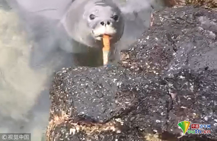 当地时间2018年4月15日,美国夏威夷,一位保护区管理员发现一只小僧海豹衔着一把废弃匕首的刀柄。这只小僧海豹刚断奶,海洋哺乳动物中心和自然资源部的工作人员一直都在关注它。