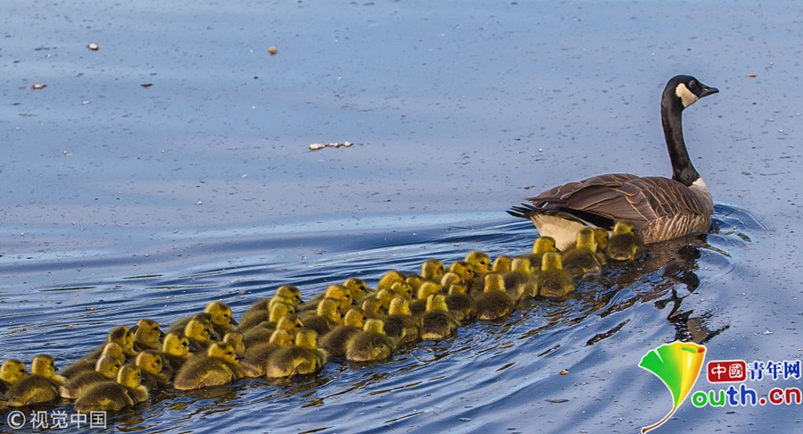 带着一群幼鹅游泳的“鹅保姆”