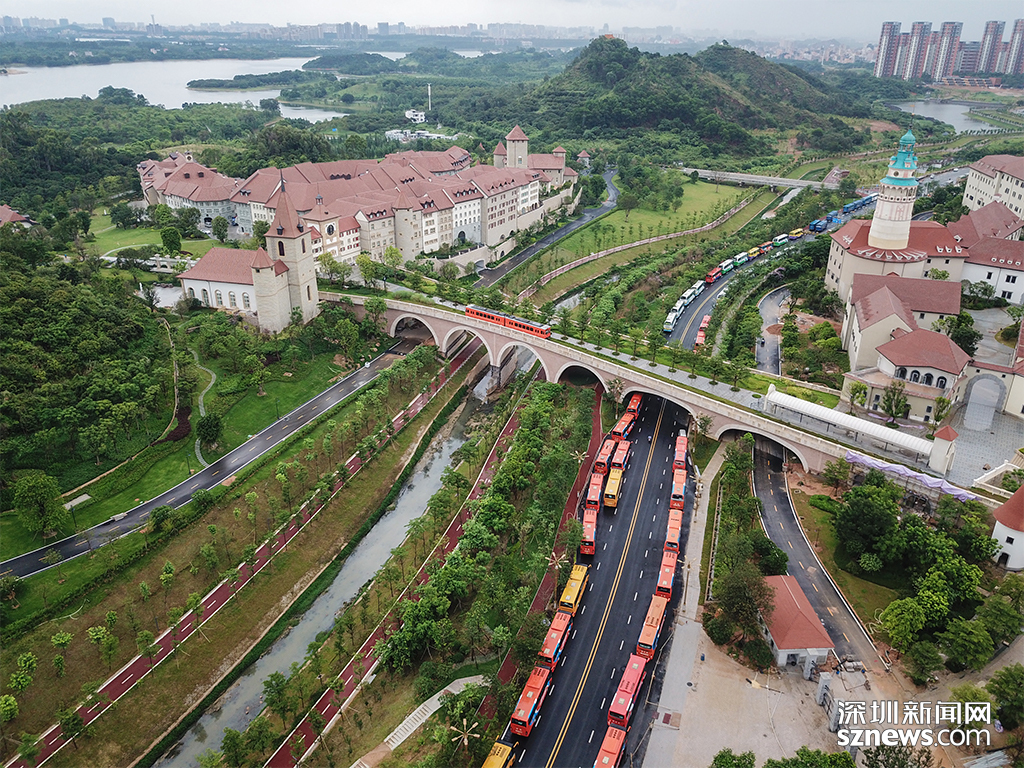 专为家住深圳的员工准备的通勤大巴整齐停在道路两侧