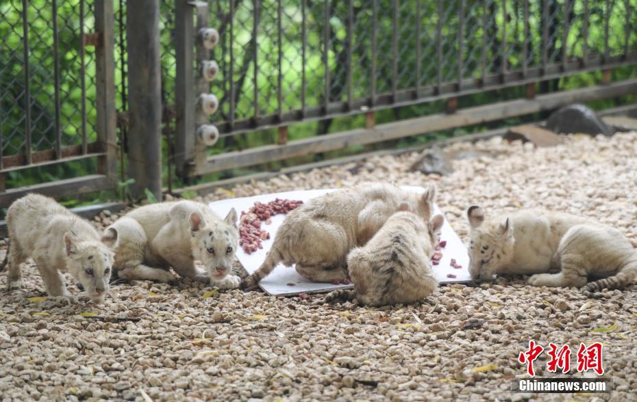 7月10日,雪虎五胞胎分享“肉馅蛋糕”。当日,济南野生动物世界五胞胎雪虎诞生满百日,正式与游客见面。中新社记者 张勇摄