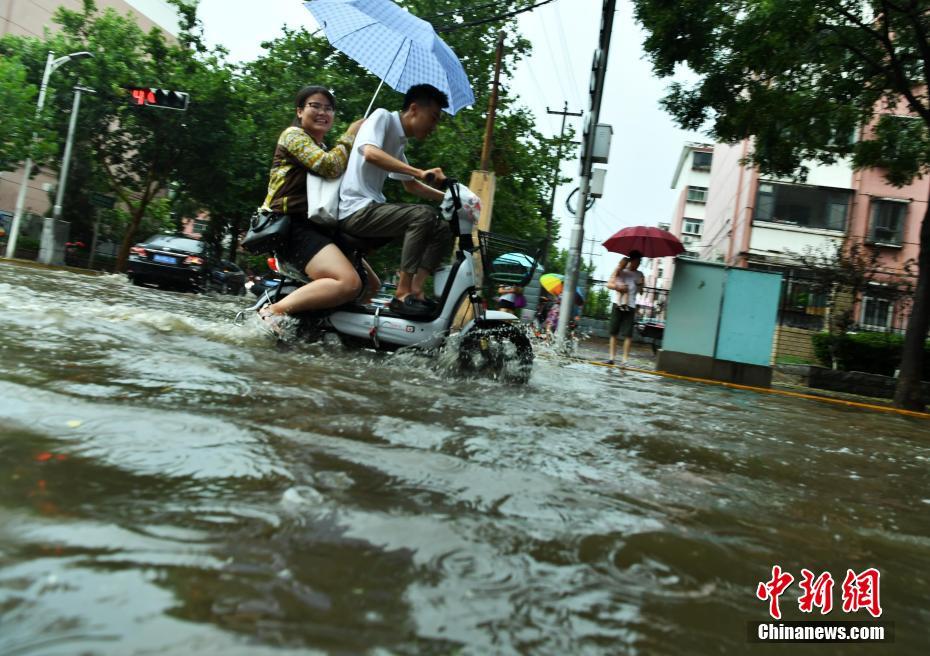 河北石家庄遭遇暴雨 道路积水民众涉水出行