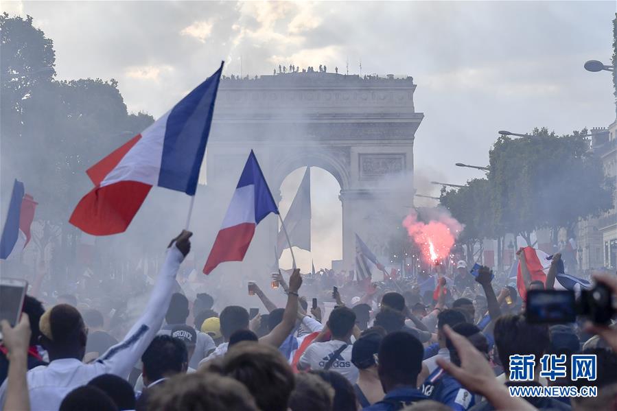 7月15日,法国球迷在巴黎香榭丽舍大街上庆祝法国队夺冠。