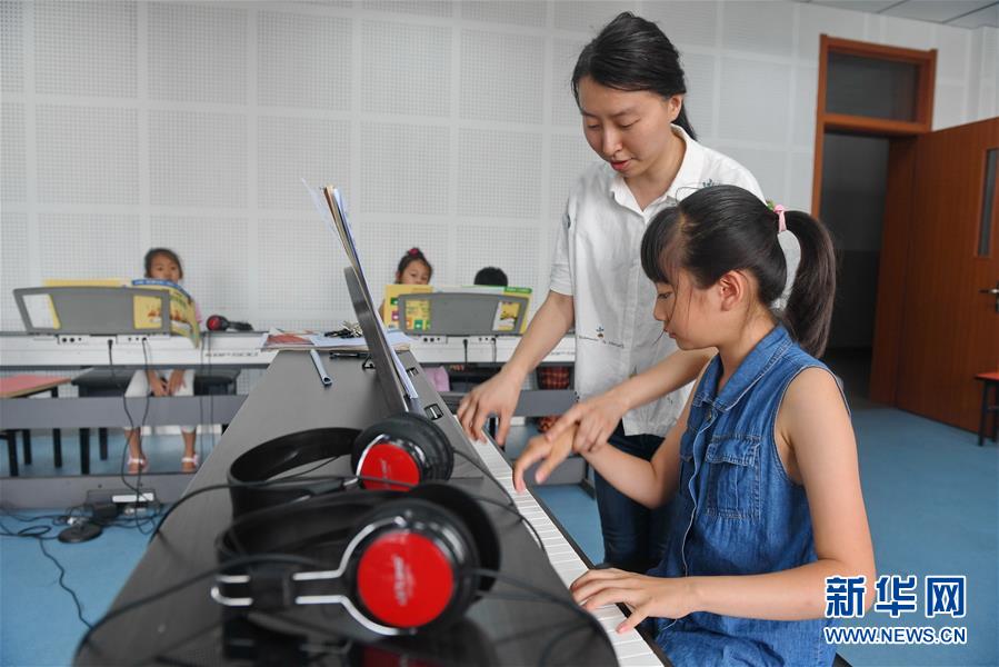 7月16日,在长春市少年宫,教师邢晨(右二)给学生上钢琴课。