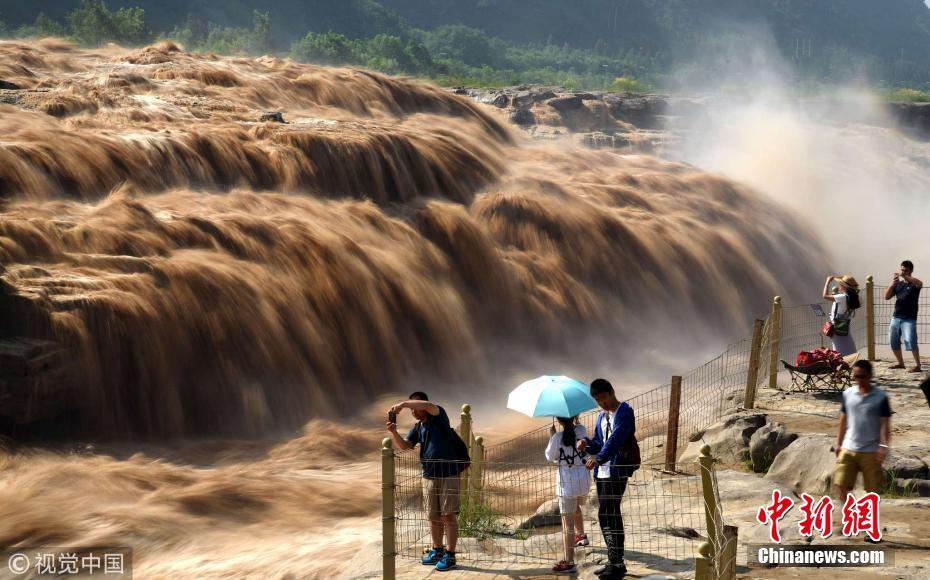 7月17日,山西临汾,游客在黄河壶口瀑布游览观瀑。进入7月主汛期,受黄河上游降雨量增多影响,位于山西吉县和陕西宜川县交界的黄河壶口瀑布水量暴涨。浊浪滔天的壮美瀑布群景观,吸引了众多游客。吕桂明摄 图片来源:视觉中国