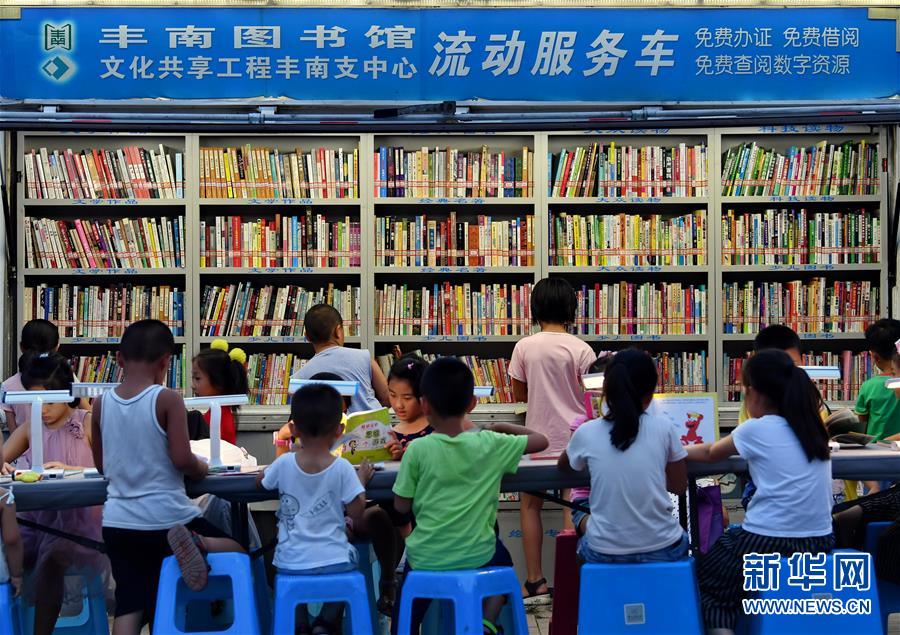 7月16日,唐山市丰南区金都花园社区的小朋友在流动服务车前翻阅图书。