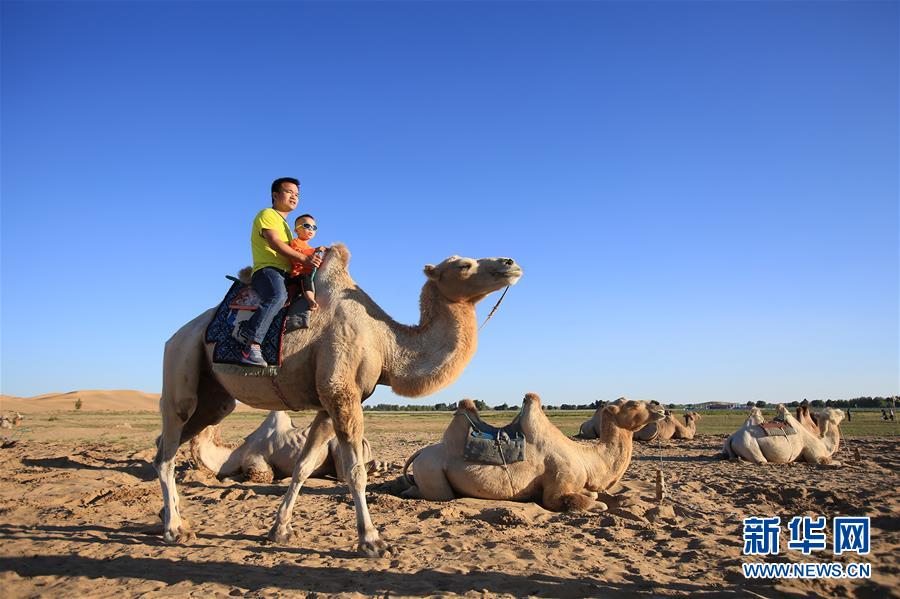 7月25日,一对父子在库布其沙漠七星湖景区体验骑骆驼。