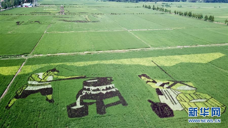 这是7月29日在安徽寿县安丰塘水库北堤拍摄的“稻田画”(无人机拍摄)。 新华社记者 张端 摄