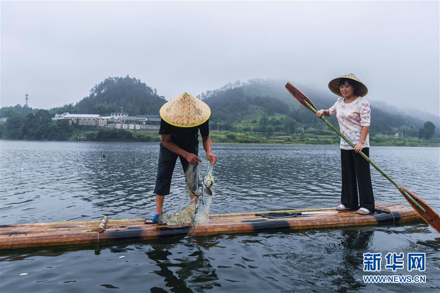 8月2日,淳安县汾口镇红星村的渔民乘着竹排,在千岛湖的支流武强溪上收网捞鱼。新华社记者 徐昱 摄
