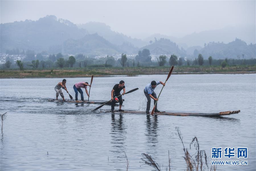 8月2日,淳安县汾口镇红星村的渔民捕捞结束后,在千岛湖的支流武强溪上进行划竹排比赛。 新华社记者 徐昱 摄